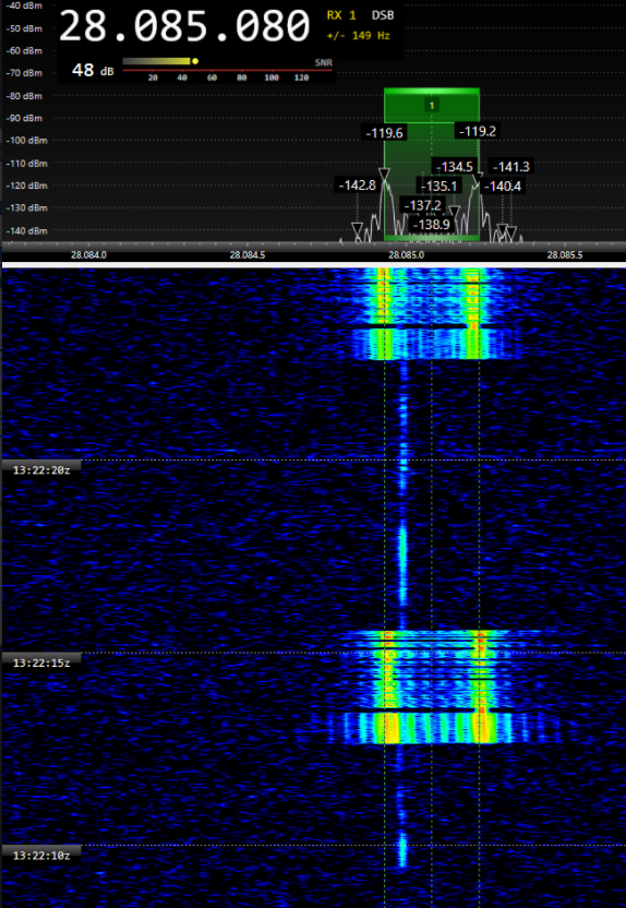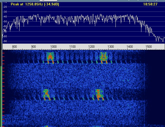 A continuación, en el primer vídeo, se puede escuchar el sonido de ambos canales de información de la señal. Con el programa FLDIGI hemos aislado el sonido de uno de los dos canales - el que contiene la información en ódigo Morse - y podréis ver cómo decodifica el QTC. En el segundo vídeo veréis que hemos aislado un poco mejor el sonido de uno de los dos canales de la señal de manera a percibir mejor el sonido de los caracteres transmitidos en código Morse.