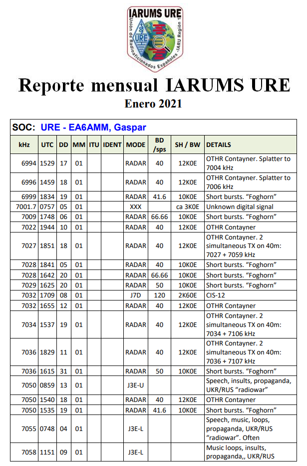 Servicio de URE, Unión de Radioaficionados Españoles, asociación miembro de IARU, que colabora activamente con el IARU Monitoring System (IARUMS), servicio mundial autorizado por el Consejo Administrativo de IARU.